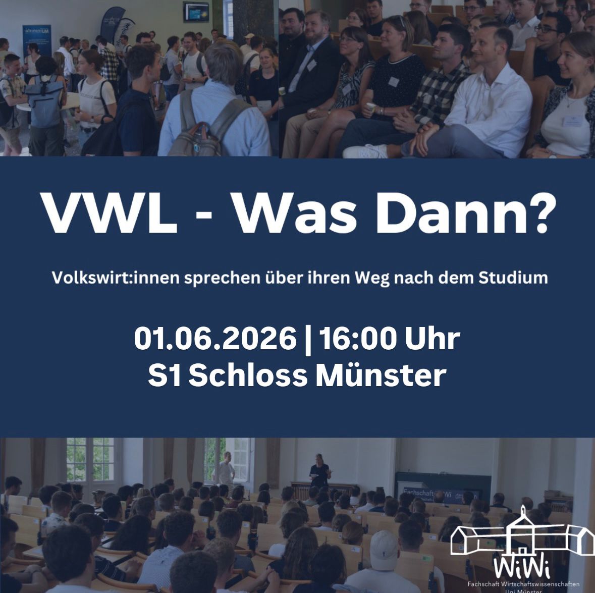 Genau dieselbe Frage haben wir uns auch gestellt und uns gedacht, das können wir als Fachschaft doch beantworten. Wohlgemerkt nicht wir persönlich, aber wir können Leute aus dem Berufsleben mit abgeschlossenem VWL-Studium einladen und einen Austausch ermöglichen. Genau das soll das „VWL – Was dann?“ sein: ein Event bei dem sich angehende Volkswirt*innen über ihre Optionen des späteren Berufslebens informieren können und vielleicht schon erste Kontakte knüpfen.